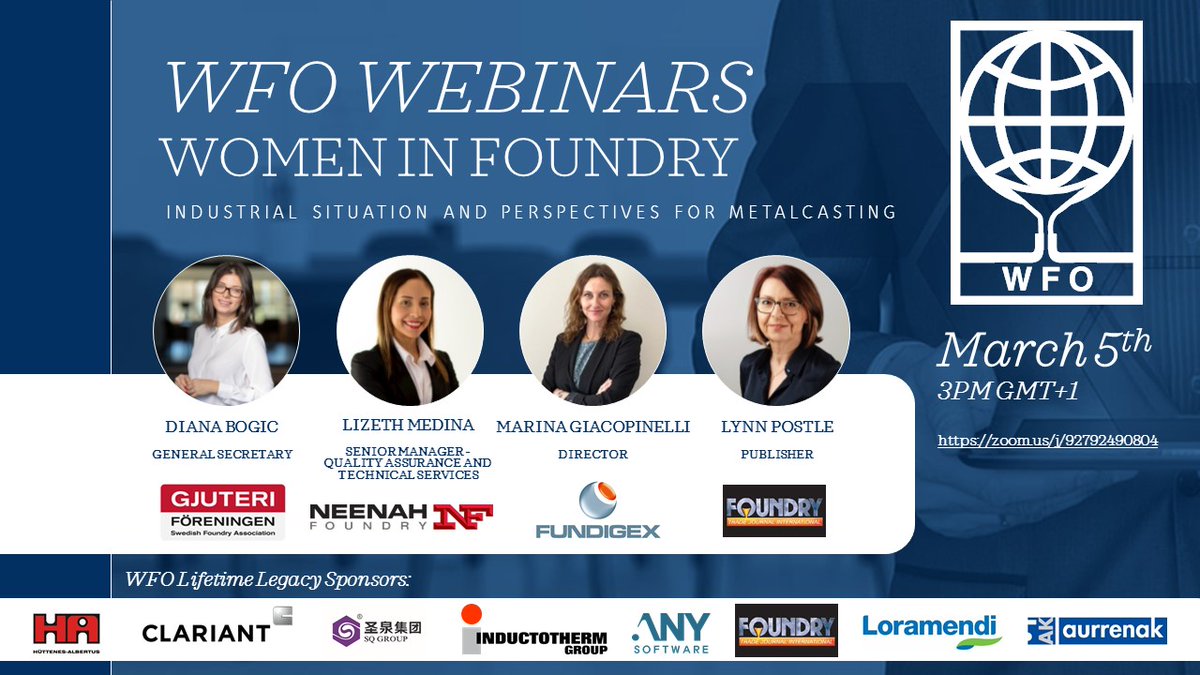 The whole event was recorded and is available to watch on the WFO YouTube channel or by following the link WEBINAR. The WFO would like to thank the panelists, Lizeth Medina, Diana Bogic, Marina Giacopinelli and Lynn Postle. Also our Lifetime Legacy Sponsors, Huttenes Albertus, AnyCastings, SQ Chemicals, Inductotherm, Foundry Trade Journal, Clariant and Loramendi/Aurrenak. |