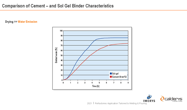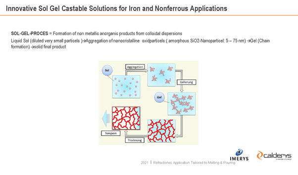 Dr Holland explained the new use of the Sol / Gel process to control the mixing of systems for lining ladles, the process has the advantage of reduced drying times (particularly late in the drying cycle where the current systems lose their water of crystallisation associated with the cement/clay bonds) and that the finished linings have higher refractoriness and lower dilation on drying.