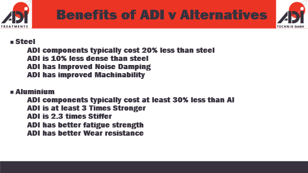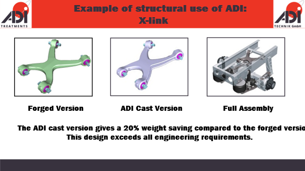 Dr Rimmer also explained how with the use of advanced foundry technology and ADI can complete with existing steel fabrications and aluminum components. Apart from weight saving, additional advantages come in the form of less logistics in terms of tooling and supply of separate parts for fabrications and having produced the initial castings the performance can be adjusted upwards from the same tooling by simply amending the heat treatment regimes, in the event the application is found to be on the limits of the initial design requirements. This again is particularly important in the current Carbon / Energy reduction climate we find ourselves in and applies equally to Diesel/petrol powered vehicles as it does to Electric/Hydrogen vehicles.