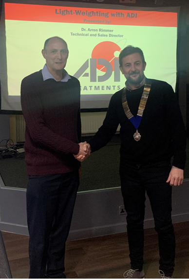 On Monday 1st November, the West Midlands Branch, and a total of 41 attendees, 21 from across the UK and the world by the internet and 20 physically at the Churchill’s venue in Wednesbury (complete with a hot buffet after the talk). We were yet again treated to a well presented, interesting and professional technical lecture / webinar delivered by the branch, this the third of the new season.   The talk demonstrated deep levels of practical experience and knowledge and was very clearly explained. The lecture ‘Light-weighting with ADI’ was kindly presented by Dr. Arron Rimmer, Technical and Sales Director of ADI Treatments limited.