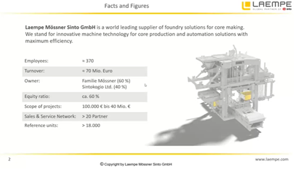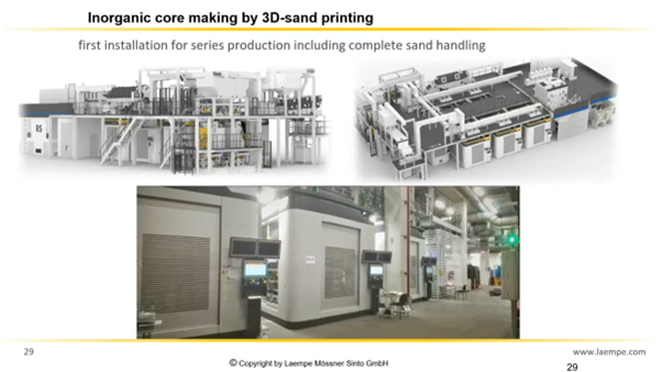 The talk included an informative comparison of the advantages and disadvantages of the Core Shooting and 3D printing with some surprising outcomes in terms of the Carbon dioxide evolution, i.e.. higher in the latter and talked of the future development of European core shops producing cores up to 2,500 kg an example he showed where he was able to blow the full core first time